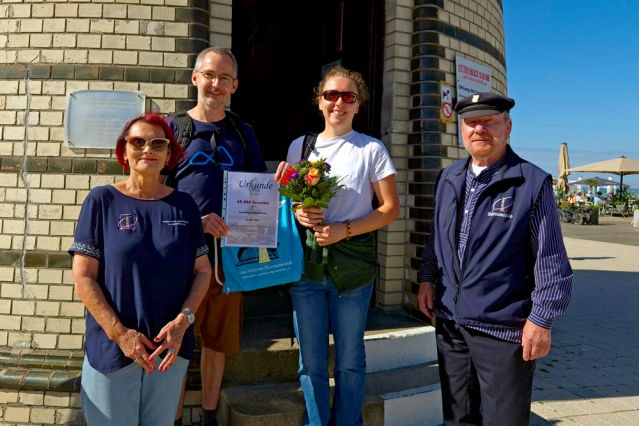 60.000. Besucherin am Warnemünder Leuchtturm begrüßtEin herrlicher Spätsommertag am Meer: Heute wurde am Warnemünder Leuchtturm die 60.000. Besucherin der Saison begrüßt. André Kroboth wird Leuchtturmbotschafter für WarnemündeFür André Kroboth schlägt das Herz im Takt der Leuchtfeuer. Nun hat der Förderverein Leuchtturm Warnemünde e.V. den 49-jährigen Warnemünder offiziell zum Leuchtturmbotschafter ernannt – eine Auszeichnung für einen Mann, der seit Jahren mit Leidenschaft für das maritime Wahrzeichen lebt und wirbt. 50.000 Besucher auf dem Warnemünder Leuchtturm: Jubiläumsgast aus Thüringen feiert Premiere„Es sieht gut aus“, strahlt Inge Morenz, Schatzmeisterin und Vorstandmitglied des Warnemünder Leuchtturmvereins, als sie auf die diesjährigen Besucherzahlen blickt. Heute wurde mit Anne Sommer aus Erfurt die 50.000. Besucherin des Jahres auf dem Wahrzeichen begrüßt. Übergabe der Leuchtturm-Chroniken an das Heimatmuseum WarnemündeEin wichtiges Kapitel lokaler Zeitgeschichte hat heute seinen Platz im Warnemünder Heimatmuseum gefunden: Walter Vogt, langjähriger Chronist des Fördervereins Leuchtturm Warnemünde e.V., übergab feierlich seine über drei Jahrzehnte hinweg gesammelten Vereinschroniken an den Museumsverein. Kunst, Klang und Erinnerung: „Musik, Kunst & Mee(h)r“ 2025 mit neuem Rockformat „20 Miles – Leuchtfeuer trifft Kulturmeer“Wenn Kunst, Klang und Meer in Warnemünde aufeinandertreffen, dann ist es wieder Zeit für Musik, Kunst & Mee(h)r. Die traditionsreiche Veranstaltungsreihe feiert am 7. und 8. Juni ihre elfte Auflage und verwandelt das Ostseebad erneut in eine offene Bühne der Begegnung, Kreativität und Emotion – inmitten von Promenade, Alexandrinenstraße und Kurhausgarten. zum Archiv |