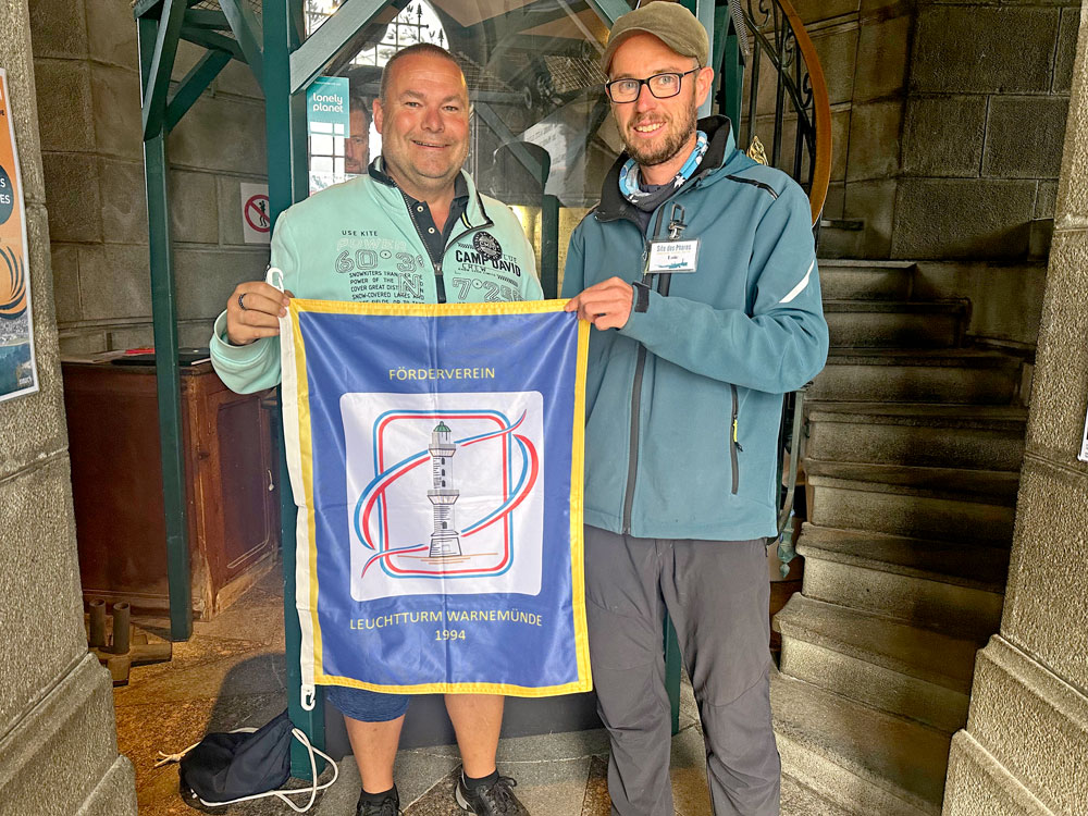11.09.2025 – Besuch des Phare d’Eckmühl, der GeschichtsträchtigeAls ich vor einem der beeindruckendsten Leuchttürme Europas stand – dem Phare d’Eckmühl aus dem Jahr 1897 –, spürte ich eine sehr vertraute Aufregung in mir. Ein Gefühl, das mich seit meiner Kindheit begleitet, immer dann, wenn ich einem so eindrucksvollen Leuchtturm begegne. Es zieht mich förmlich nach oben. Der Phare d’Eckmühl erhebt sich mit seinen 65 Metern majestätisch aus der bretonischen Landschaft. 307 Stufen führen hinauf zur Laterne – Stufe für Stufe dem Licht entgegen. Besonders berührt hat mich die Begegnung mit dem jungen Leuchtturmmann vor Ort. Wir machten ein gemeinsames Foto. Ich zeigte ihm „meinen“ Leuchtturm zu Hause in Warnemünde und erzählte von meiner Heimat. Wir verstanden zwar nicht jedes Wort, doch wir verstanden uns: mit Gesten, Lachen, Blicken – und mit der universellen Sprache der Leuchtturmleidenschaft. Dieser persönliche Moment war etwas ganz Besonderes für mich. Auch der Aufstieg über die offene Wendeltreppe mit ihren hellen Kacheln war eindrucksvoll. Schritt für Schritt nach oben, dem Licht entgegen. Im Inneren des Turms erinnert ein Raum an den Marschallprinzen von Eckmühl. Seine Tochter Adélaide ließ diesen Leuchtturm zu seinen Ehren errichten. Der Name führt zurück nach Eggmühl in Bayern, einem historischen Ort aus der Zeit Napoleons. Und dann öffnet sich der Blick aus schwindelerregender Höhe: Die raue Küste von Penmarc’h liegt einem zu Füßen. Tosendes Wellenrauschen, pfeifender Wind – und zugleich eine tiefe Stille. Rau, kraftvoll und doch unglaublich lebendig. Mit einem Hochgefühl setzte ich mich schließlich wieder in mein Wohnmobil Betzi und steuerte weiter entlang der bretonischen Küste, Richtung Norden. (Fotos: Privat) |